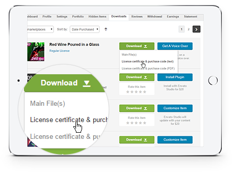 - Click ‘download’ button, and in the drop down menu select “license sertificate & purchase code”
